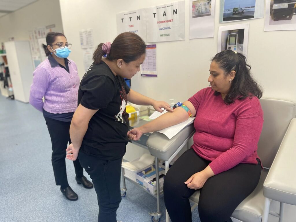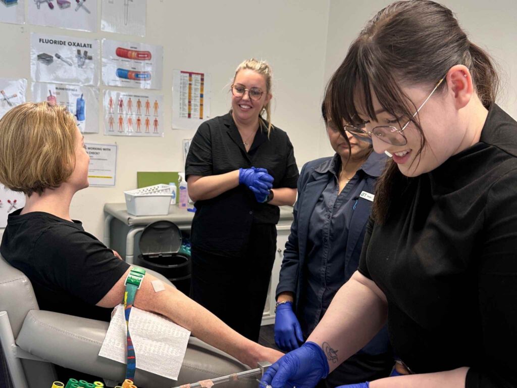 During a blood test, a needle is inserted through the skin to reach a vein. While it’s a safe procedure,